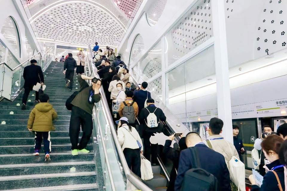 来到13号线一期幸福梅林站,刚上扶梯就听到体验官们“哇”声一片,车站整体空间以梅花为主要元素,漫反射灯光烘托出“游梦梅庭”的氛围。