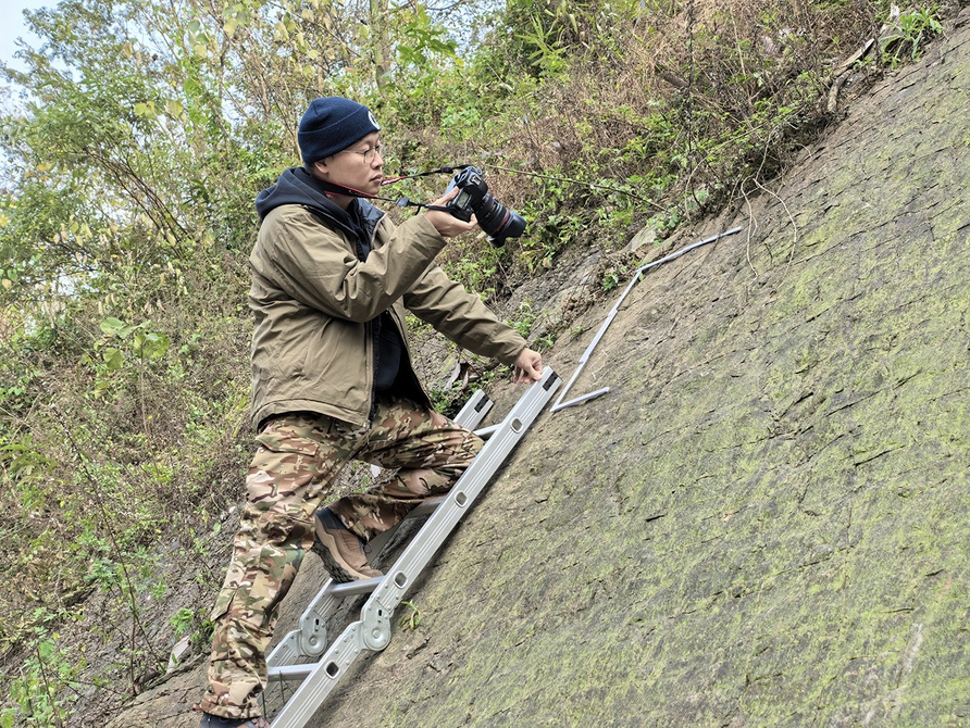 这处让他们眼前一亮的遗迹,位于都江堰九鼎大道附近一处沉积岩岩壁上,11月23日由户外爱好者严宗米在徒步过程中发现。清晰的爪印和挤压纹理,让地质学专业出身的严宗米立刻意识到可能是古生物足迹,随后他联系了邢立达。经过邢立达团队进一步鉴定,确认它们出自距今2亿年前的三叠纪晚期地层。