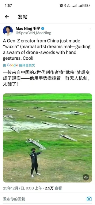 “一位来自中国的Z世代创作者将‘武侠’梦想变成了现实——他用手势操控着一群无人机剑。太酷了!”12月7日,外交部新闻发言人毛宁在海外社交平台点赞成都博主“范十三”。
