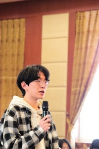 西南民族大学武侯校区青年传习志愿者顾国东向曹锦炎提问。