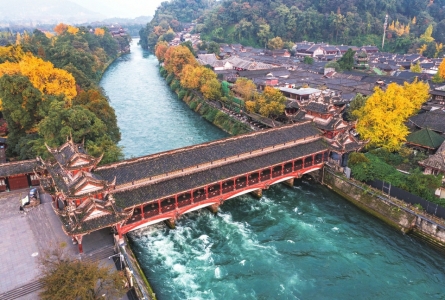 都江堰碧绿的岷江水和金黄色的银杏相映成趣。杨涛 摄