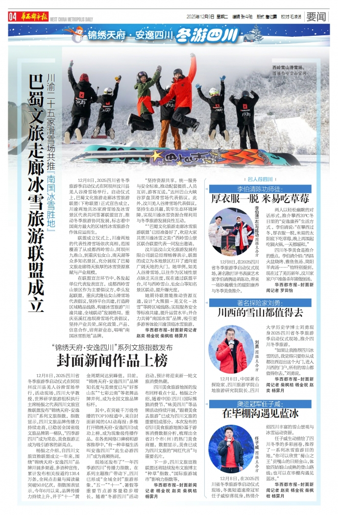 她期待联盟能推动资源互通,设计“大熊猫-羌文化-冰雪”等跨区域线路;实现服务安全等标准共建,提升运营水平;并合力共铸“南国冰雪”品牌,吸引更多游客体验川渝顶级冰雪旅游。