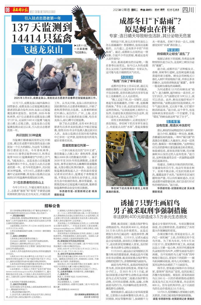 12月7日,成都龙泉山城市森林公园管委会、成都龙泉山迁徙猛禽监测志愿者团队联合发布2025龙泉山迁徙猛禽监测年度报告。报告称,2025年春秋两季,427位志愿者在成都龙泉山蹲守137天,记录到14414只猛禽飞越龙泉山踏上迁徙之路。这是龙泉山迁徙猛禽监测点成立以来,引入驻点志愿者的第一年。