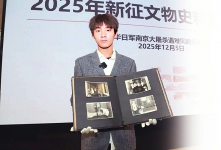 12月5日,南京。侵华日军南京大屠杀遇难同胞纪念馆举行2025年新征文物史料发布会,共有13件(套)文物史料入藏。其中,一封由侵华日军中尉于1937年12月18日寄往日本福岛县的信件,以及日军“花见部队”相册,由江苏省徐州市沛县汉兴高级中学高一学生于聍鹏捐赠。