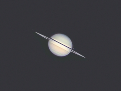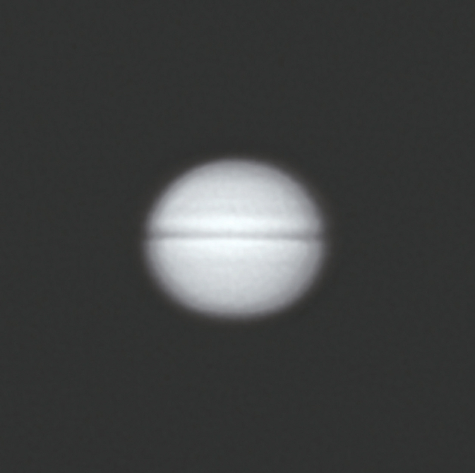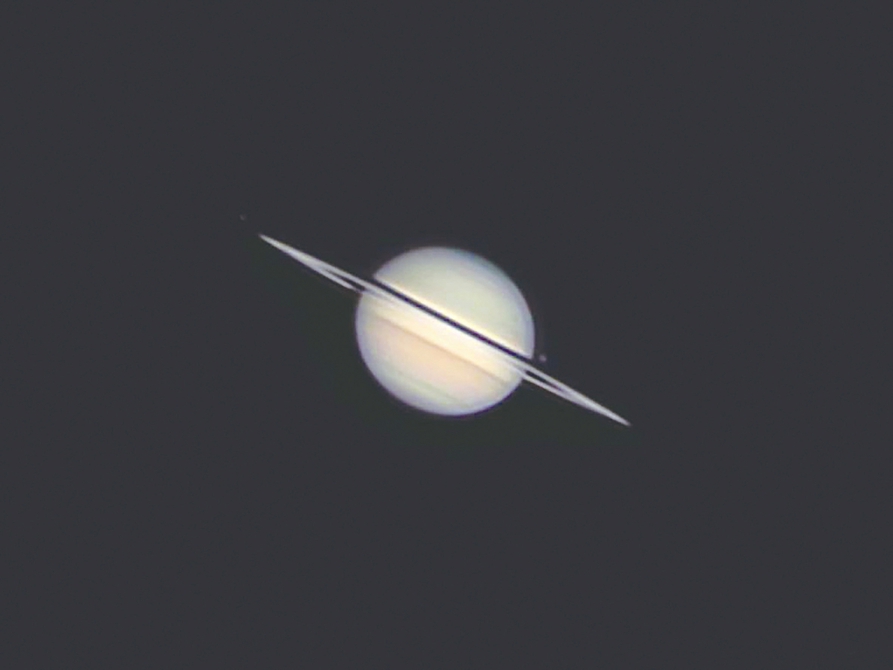 2025年4月29日在广东中山拍摄的土星特写,土星中间的黑线是土星环及其投影。