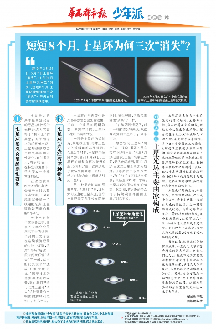 土星环的形态变化是众多参数复合叠加的结果,并非一个简单的周期函数。刘东宇介绍,土星环“消失”有两种情况——