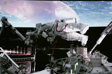 这是12月月9日在北京航天飞行控制中心屏幕上拍摄的神舟二十一号乘组航天员张陆在舱外工作的画面。 新华社发