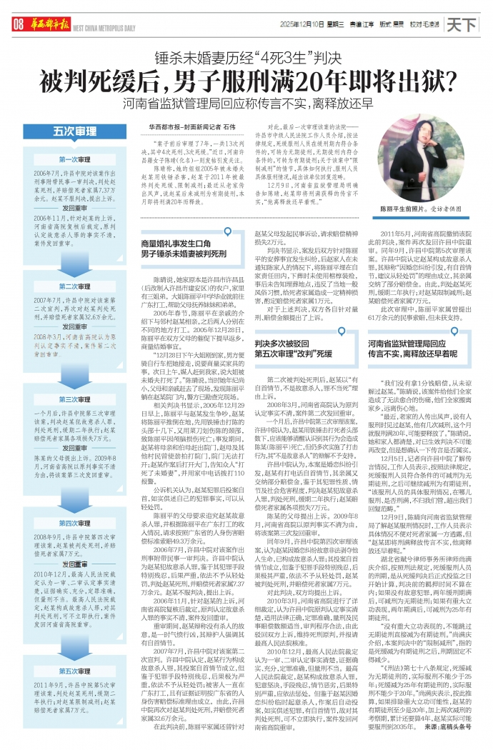 “最近,老家的人传出风声,说有人服刑时见过赵某,他有几次减刑,这个月就服刑满20年,可能要释放了。”陈晴说,她和家人都清楚,对已生效判决不可能再改变,但是想确认一下传言是否属实。