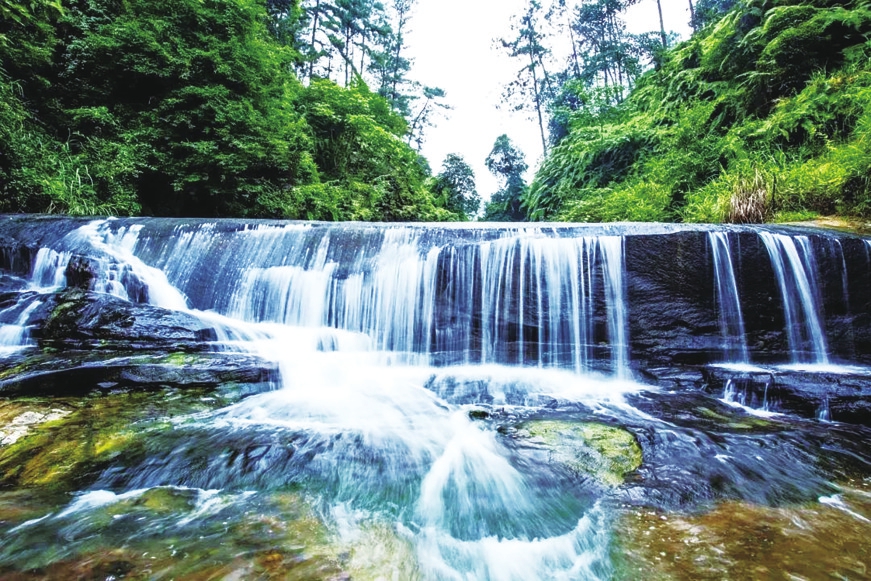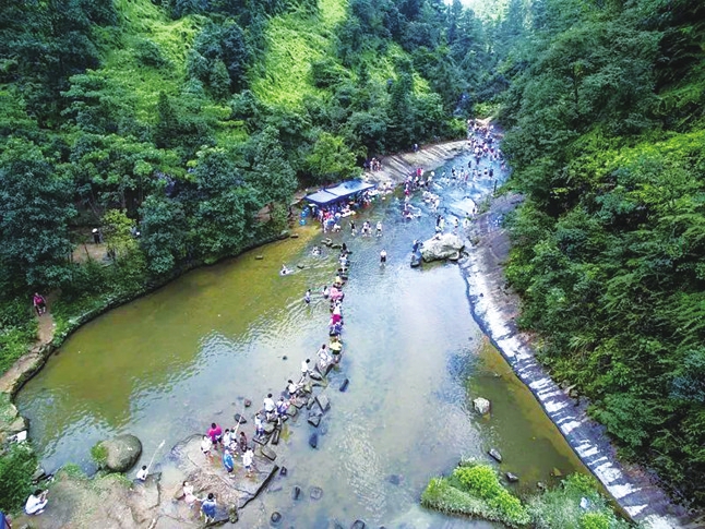 石 板 河的魅力,在于石与水的和谐共生。整块岩石构成的河床,宽达300 米,坡度平缓,常年平均水深仅 40到50厘米,安全宜人,是天然的戏水胜地。河水源自穹窿深处,纯净无污染,加上98%的森林覆盖率形成的小气候,夏季气温比周边低4℃~6℃,成为川南罕见的避暑天堂。