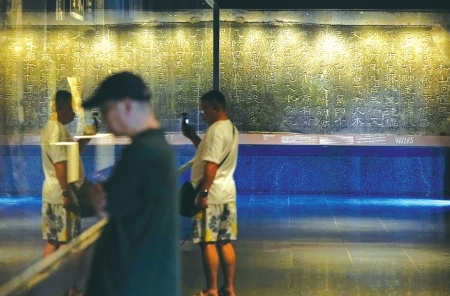 游客在汉中市博物馆观看摩崖石刻“石门十三品”。新华社发