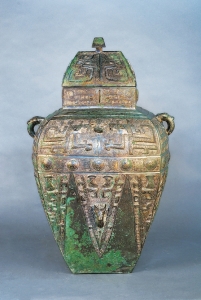 典型如城固县博物馆的镇馆之宝——商兽面纹铜罍。这个高51.2厘米、面宽15.3厘米的器物,方唇,直颈,圆肩,弧腹,凹底,肩两侧施牛形首一对,背面腹下部有一羊首鋬,盖、颈四面各施一道扉棱,盖和握手皆饰倒置卷角饕餮纹。肩部两面各饰一高浮雕,卷角为两部分,上部为涡纹间饰夔纹,两面各有五个涡纹。
