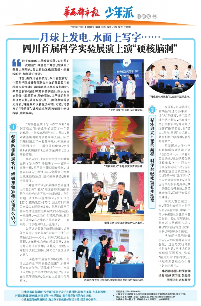日前,由四川省科技厅、四川省教育厅、中国科学院成都分院联合主办的首届四川省科学实验展演汇演活动总决赛在成都举行。来自全省各地的20支科普实验队伍从近百支队伍中脱颖而出,登台竞技,以严谨的科学原理为内核,融合实验、段子、舞台表演等多元形式,将高深知识转化为可看、可感、可参与的“科学秀”,让观众在笑声与惊叹中走近科学、理解科学。