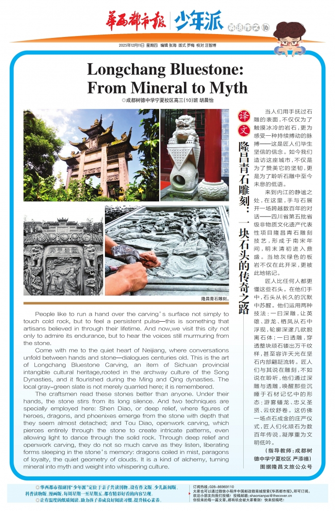 Come with me to the quiet heart of Neijiang, where conversations unfold between hands and stone—dialogues centuries old. This is the art of Longchang Bluestone Carving, an item of Sichuan provincial intangible cultural heritage,rooted in the archway culture of the Song Dynasties, and it flourished during the Ming and Qing dynasties. The local gray-green slate is not merely quarried here; it is remembered.