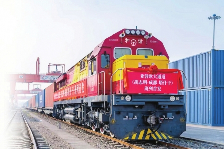 12月16日,成都国际铁路港,亚蓉欧大通道(胡志明—成都—塔什干)班列首发。这趟从越南胡志明发出、运载越南牙刷等百货的班列,在抵达成都国际铁路港完成编组后继续一路向西驰骋,预计12天后抵达位于中亚的乌兹别克斯坦塔什干。 这是中越班列和中亚班列首次在成都“牵手”,标志着亚蓉欧大通道再添运输新动脉——首次实现东南亚与中亚区域的班列互联互通。P04
