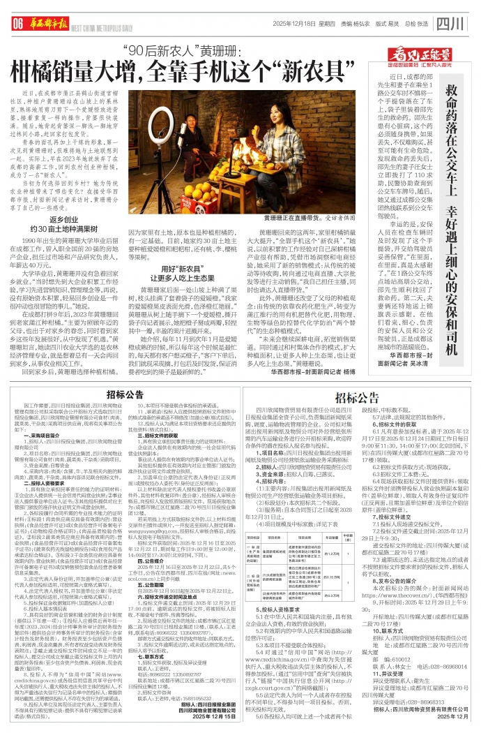 在成都打拼9年后,2023年黄珊珊回到老家蒲江种柑橘。“主要为照顾年迈的父母,也出于对家乡的眷恋,同时看到家乡这些年发展很好,从中发现了机遇。”黄珊珊坦言,她读四川农业大学选的是农林经济管理专业,就是想着总有一天会再回到家乡,从事农业相关工作。