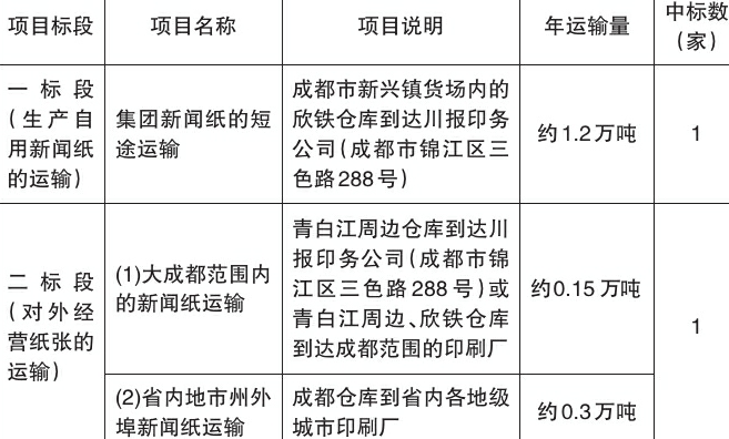 四川欣闻物资贸易有限责任公司3、资金来源:招标人自筹,已落实。4、招标内容:(1)主要内容:川报集团出报用新闻纸及物贸公司生产经营纸张运输业务项目招标。