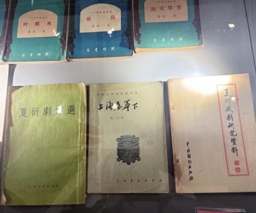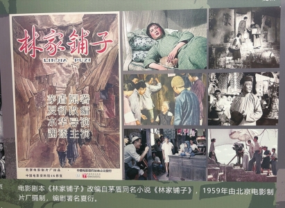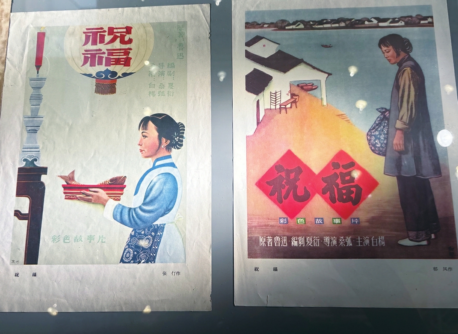 “剧影双峰——夏衍的戏剧与电影”展览上展出的夏衍编剧的电影《林家铺子》《祝福》的海报和夏衍的部分剧作(从左至右)。 张杰摄