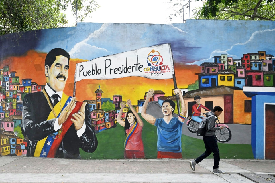 12月2日,在委内瑞拉首都加拉加斯,行人从支持委内瑞拉总统马杜罗的涂鸦墙前走过。 图据新华社客户端