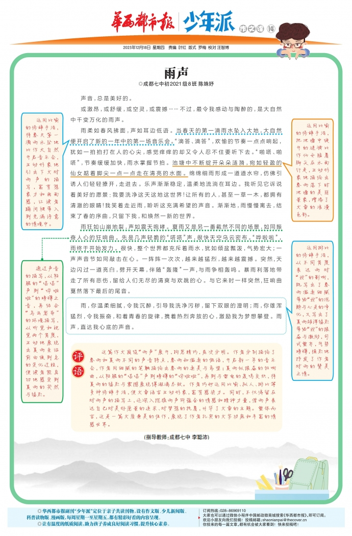 这篇作文围绕“雨声”展开,构思精巧,层次分明。作者分别描绘了春雨和夏雨不同的声音特点,春雨如温柔的低语,开启新一年的音乐会,作者用细腻的笔触描绘出春雨的柔美与希望;夏雨似振奋的狂响曲,从轻脆的“嗒嗒”声到磅礴的“哗啦啦”,再到与雷电的轰鸣交织,将夏雨的猛烈与震撼展现得淋漓尽致。作者巧妙运用比喻、拟人、排比等多种修辞手法,使文章语言生动形象,富有感染力。同时,不仅停留在对雨声的描写上,还深入挖掘雨声所蕴含的情感和精神力量,借雨声表达自己对美好愿景的追求、对梦想的执着,升华了文章的主题。整体而言,这是一篇文质兼美的佳作,展现了作者扎实的文字功底和丰富的情感世界。