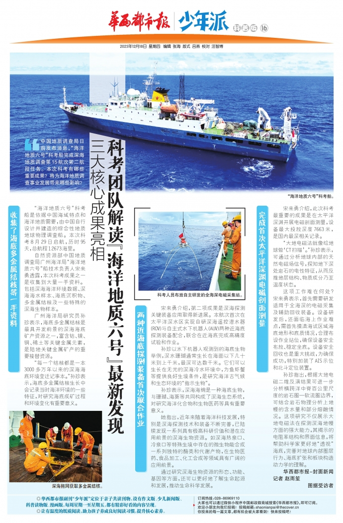 中国地质调查局日前发布消息,“海洋地质六号”科考船完成深海地质调查第15航次第二航段任务。本次科考有哪些重要成果?将为海洋地质调查事业发展带来哪些影响?