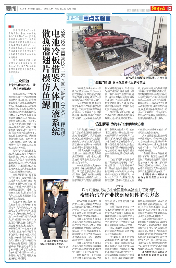 吉林大学汽车底盘集成与仿生全国重点实验室是我国布局在汽车工程科技领域、开展应用基础研究的首批国家重点实验室。近日,华西都市报、封面新闻记者专访了该实验室主任高镇海教授,与他一起畅聊中国汽车工业的未来。