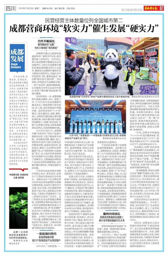 岁末的成都,热潮涌动、机遇迸发。第五届成都都市圈建设论坛刚刚落幕,12月20日,成都都市圈走进长三角投资推介系列活动又在长三角地区举行,向东部企业递出合作橄榄枝;影视音乐产业推介会星光熠熠,20余个优质项目签约落地,为文化产业注入强劲动能;“优化营商环境70条”落地见效,“有需必应、无事不扰”的服务品牌持续擦亮,让投资兴业的土壤更加肥沃。今年截至目前,成都民营经营主体合计超390万户,位列全国城市第二位。