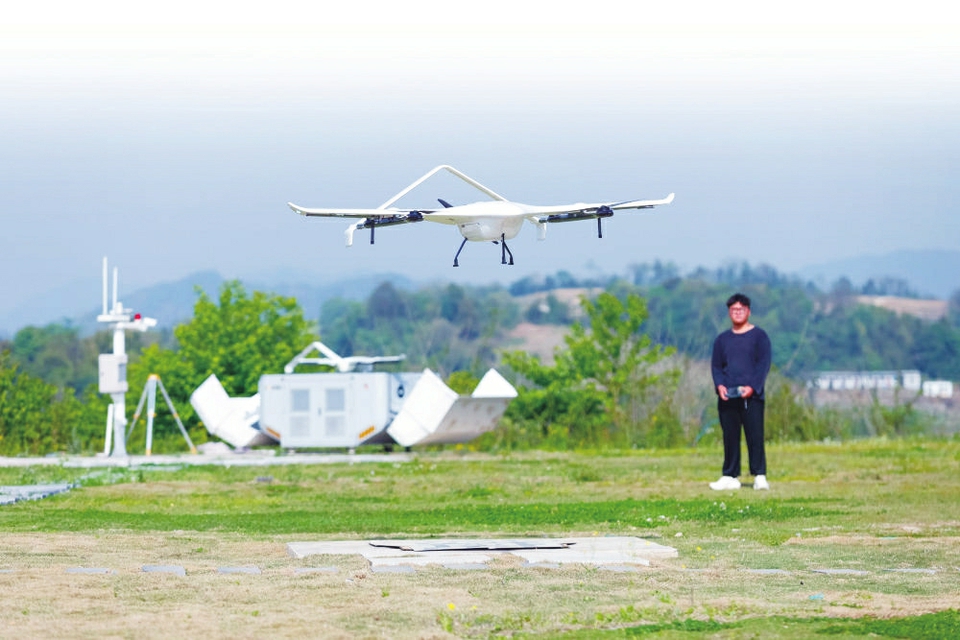 2025年4月8日,工作人员在成都彭州国家级民用无人机驾驶航空试验基地“天空之眼”试飞一款无人机产品。