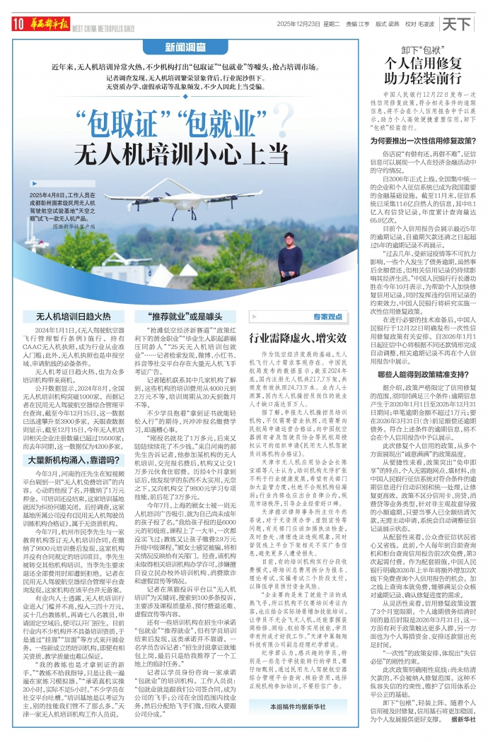 纪学君认为,感兴趣的学员,特别是一些急于学技能转行的学员,要仔细甄别,通过民用无人驾驶航空器综合管理平台查询、核验资质,选择正规机构参加培训,不要轻信广告。