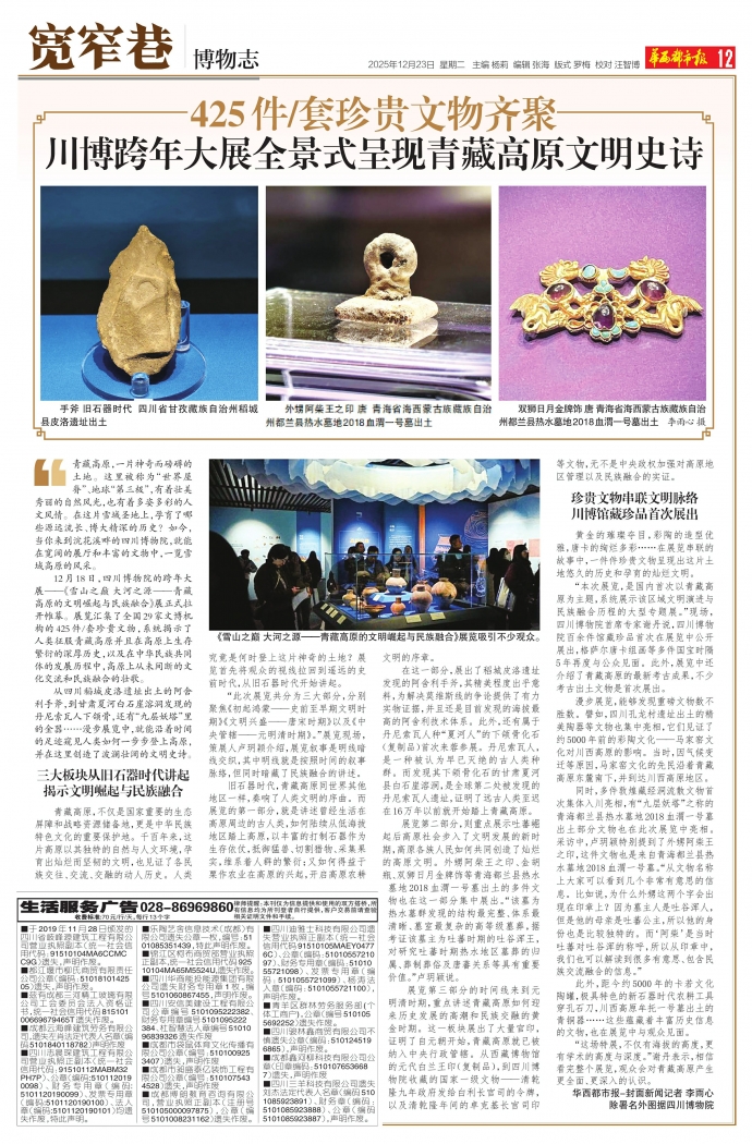 12月18日,四川博物院的跨年大展——《雪山之巅大河之源——青藏高原的文明崛起与民族融合》展正式拉开帷幕。展览汇集了全国29家文博机构的425件/套珍贵文物,系统揭示了人类征服青藏高原并且在高原上生存繁衍的深厚历史,以及在中华民族共同体的发展历程中,高原上从未间断的文化交流和民族融合的壮歌。