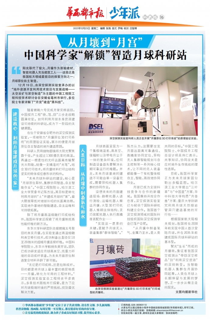 “无论是打印成砖,还是拉制成纤,目的都是将月球上最丰富的表层物质——月壤,转化为可用的工程材料。”深空探测实验室总工程师史平彦表示,多条技术路线并行探索,是为了应对月球极端环境的严苛挑战,找到最优解决方案。