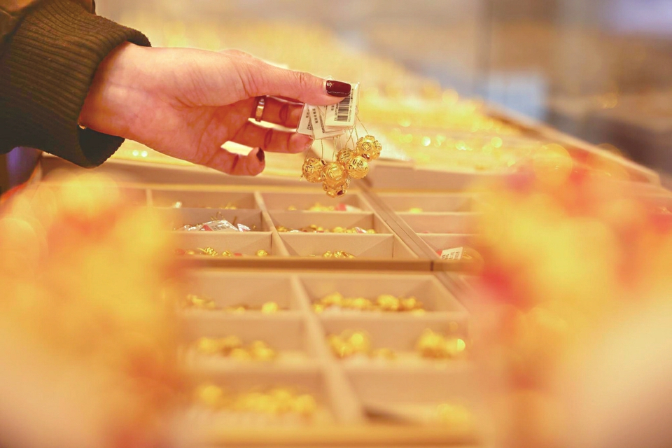 2月11日,在浙江省湖州市德清县乾元镇一家金店,店员整理黄金首饰。图据新华社客户端
