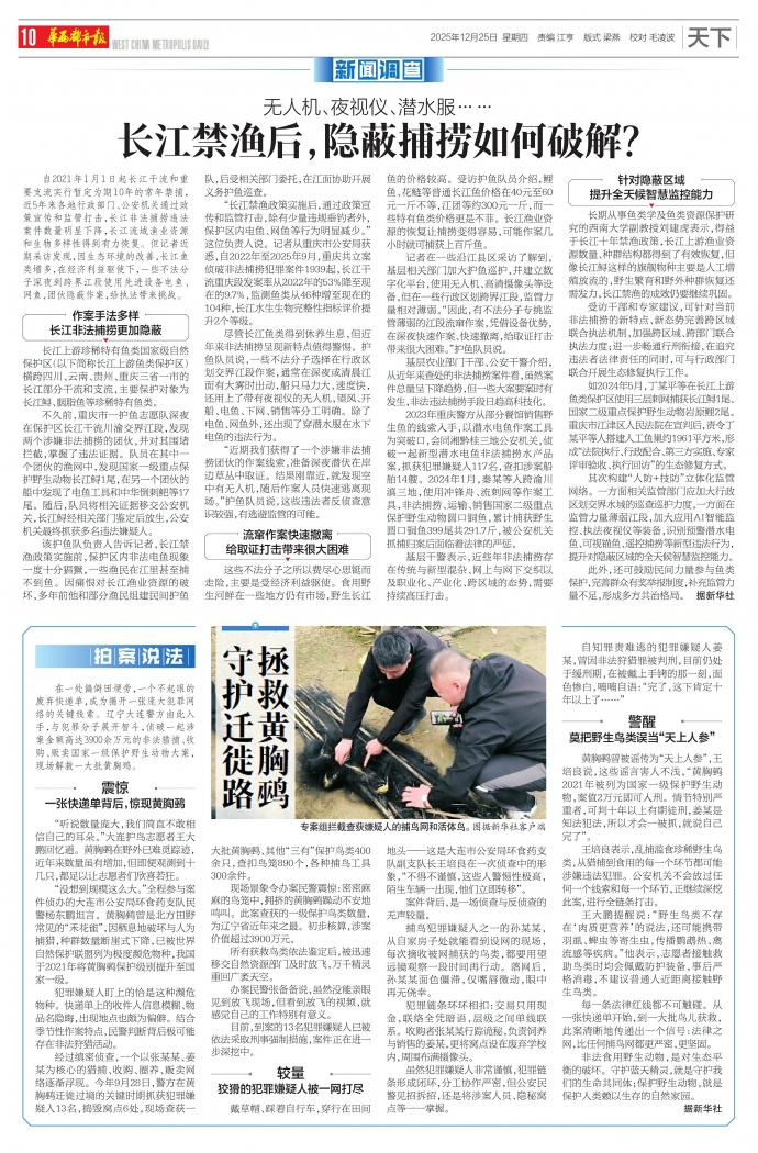 尽管长江鱼类得到休养生息,但近年来非法捕捞呈现新特点值得警惕。护鱼队员说,一些不法分子选择在行政区划交界江段作案,通常在深夜或清晨江面有大雾时出动,船只马力大、速度快,还用上了带有夜视仪的无人机,望风、开船、电鱼、下网、销售等分工明确。除了电鱼、网鱼外,还出现了穿潜水服在水下电鱼的违法行为。