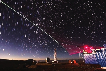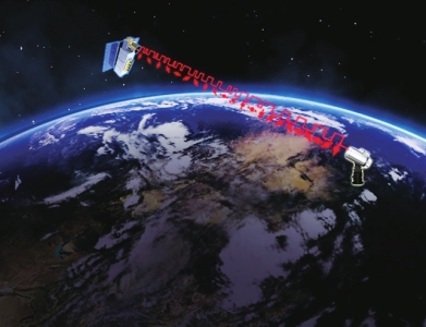 “墨子号”量子科学实验卫星与阿里量子隐形传态实验平台建立天地链路(合成照片)。