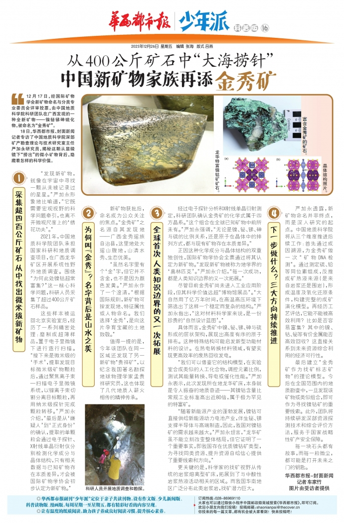 “虽然名字里有个‘金’字,但它并不含金,也不是因为颜色发黄。”严加永作了一个澄清,“根据国际规则,新矿物可按发现地、特征属性或人物命名。我们选择‘金秀’,是向这片孕育宝藏的土地致敬。”