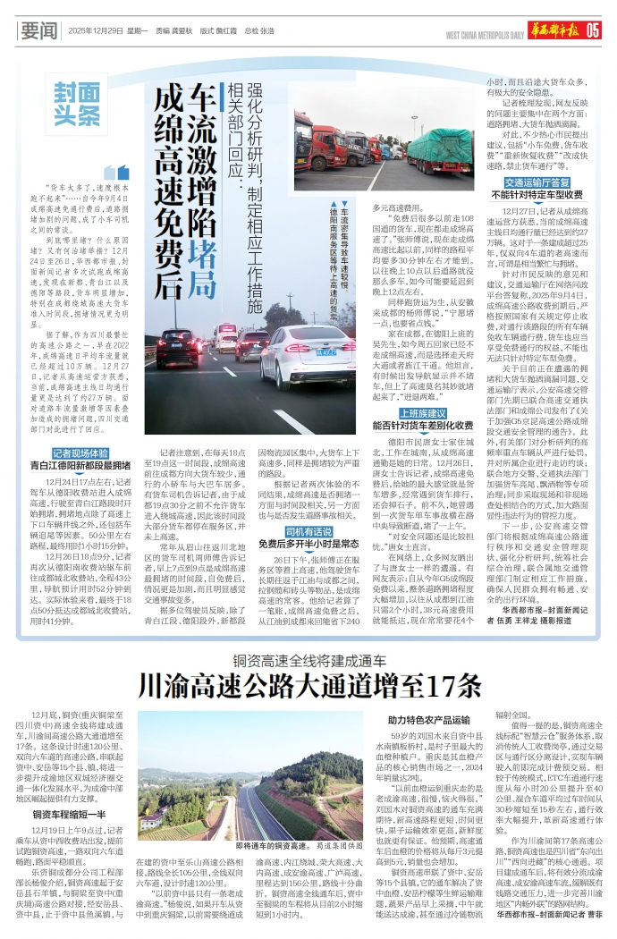 “货车太多了,速度根本跑不起来”……自今年9月4日成绵高速免通行费后,道路拥堵加剧的问题,成了小车司机之间的常谈。