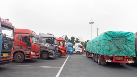 德阳南服务区等待上高速的货车。