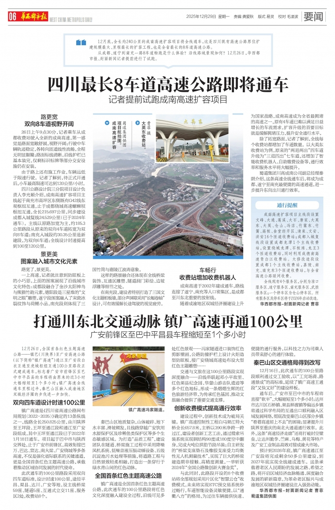 12月26日,全国首条红色主题高速公路——镇巴(川陕界)至广安高速公路(以下简称“镇广高速”)通江至广安段白衣互通至虎城枢纽互通100公里路段正式建成通车,标志着广安市前锋区至巴中市平昌县的车程将由原来的近3小时大幅缩短至1个多小时;镇广高速全线通车里程过半,秦巴山区融入成渝地区双城经济圈的步伐进一步加快。