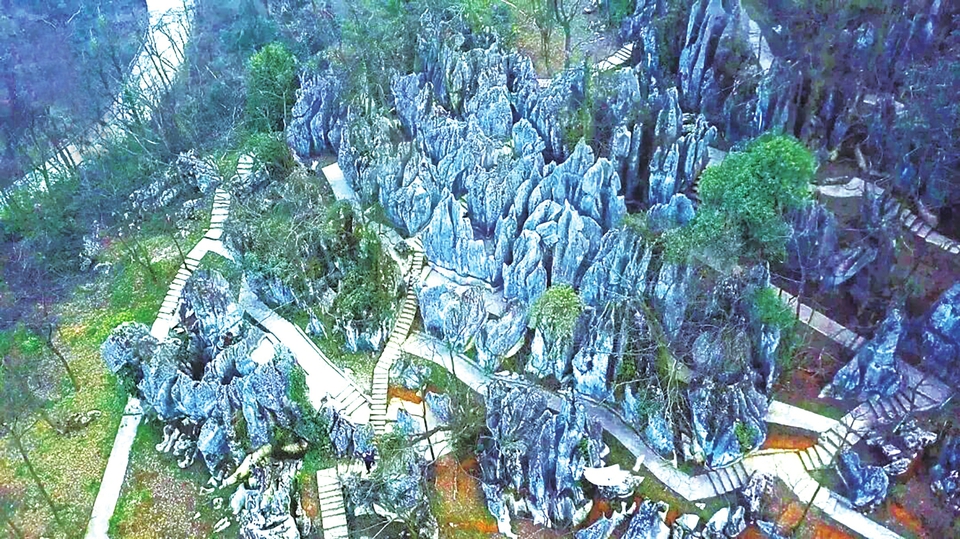 行至美女峰乳峰处,地势渐趋平缓。石林奇观分布于海拔800米至1337米之间,面积约10平方公里,为景区核心区域。