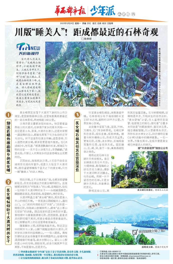 美女峰景区坐落于大渡河下游的乐山市沙湾区,是国家级森林公园,这里有距离成都最近的一处石林景观,两地相距160公里。