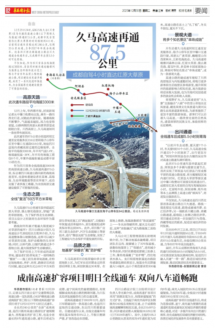 12月29日24时,G0615线久治(川青界)至马尔康段高速公路(以下简称久马高速)再通87.5公里,成都市民自驾前往红原大草原的时间缩短到4小时。目前项目通车里程达到186公里,仅剩33公里未通,力争2027年年底全线通车。这条四川西北部高速公路出川大通道全线通车后,从成都开车出发5.5小时可达青海。