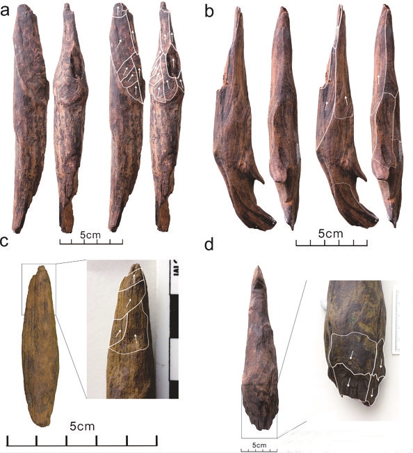 这些木器主要用松木制作,宏观和显微观察发现:一些标本存在因砍枝削尖而留下的削刮痕,尖端发生因使用而产生的磨光条痕和断裂破损。这些痕迹出现在特定部位并具有方向性,是人类加工与使用的证据。