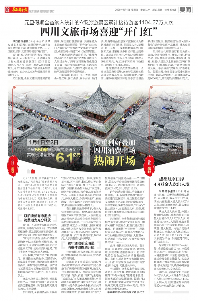 2025年,成都航空口岸共有640万余人次、4.8万余架次航班出入境,同比增长12.6%、14.1%,出入境人员、航班量位居中西部地区对外开放航空口岸首位。