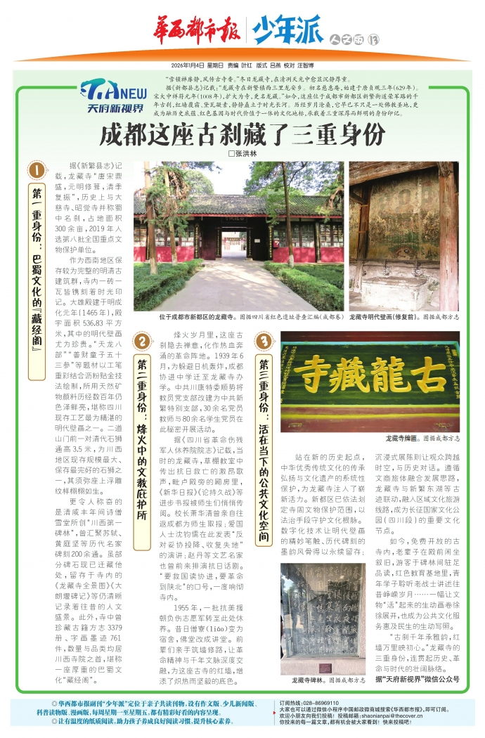 “古刹千年承雅韵,红墙万里映初心。”龙藏寺的三重身份,连贯起历史、革命与时代的壮阔脉络。据“天府新视界”微信公众号