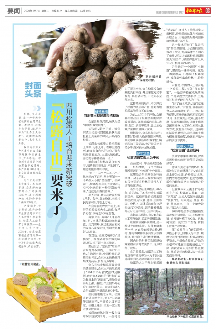 “除了技术攻关,我们更注重生态保护。”尹胜说,菌根苗培育从2023年就开始了。通过保育促繁,将松露的采挖期延后至11月,让松露充分成熟、孢子散落,保障种群延续;采用土壤修复菌剂补充、人工仿生补菌丝体等方式,优化生长环境。这两年的试验结果显示,示范区的土壤与植被显著修复,松露的产量与品质实现双提升。