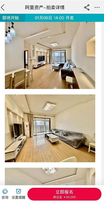 阿里资产拍卖平台的信息显示,这套房屋在1月6日下午2点再次拍卖,起拍价格仍然为26.6万元,房屋建筑面积89.70平方米,两居室两厅一卫户型,为精装修交付。