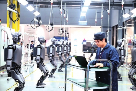 广西柳州市北部生态新区机器人产业园,工人检查即将下线的工业版人形机器人。