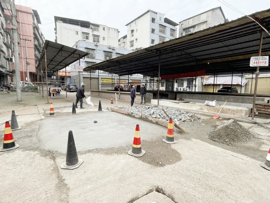 1月6日上午,在桐子村农贸市场,几名工人正在对一大块约10平方米破损的空地进行修补,地面刚铺上水泥,尚未干透,旁边还有一大堆被清理出来的碎石块。