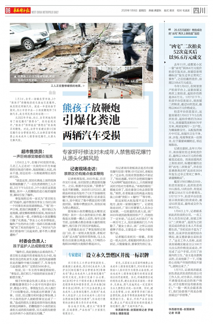 1月3日,自贡一场镇农贸市场,3个“熊孩子”将鞭炮扔进化粪池引发爆炸,殃及附近两辆汽车。就在一年前的春节期间,内江市资中县一小孩放鞭炮炸了8辆汽车,成为网民热议的话题……