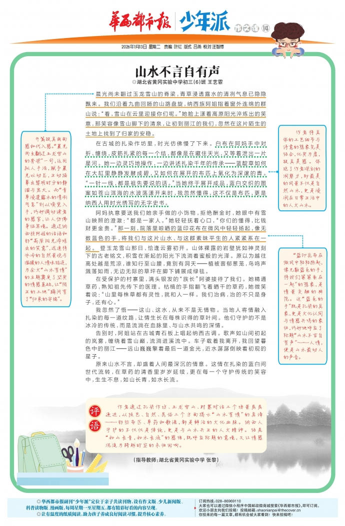 递进,从技艺、自然、民俗三个方面揭示“山水有情”的真谛——那些布匹、草药和歌谣,都是鲜活的文化血脉。纳西人守护的不仅仅是传统,更是与山水共生的人文精神。结尾“如山长青,如水长流”的感悟,既呼应标题的意境,又让情感