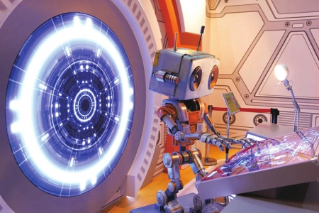 2025年6月28日在中国科学技术馆《Project X:星际友好计划》航天科幻扩展现实(XR)大空间体验展拍摄的人工智能机器人星启8号。